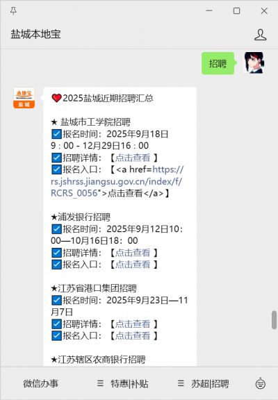 温馨提示:微信搜索并关注【盐城本地宝】,在聊天对话框内回复关键词【招聘】,即可获取盐城市更多招聘岗位招聘时间、招聘详细、盐城师范学院招聘详细以及更多其他招聘信息等